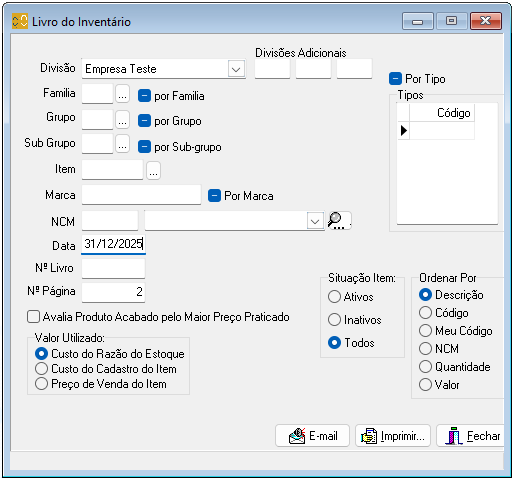 • Em Data, informe a data de referência do estoque.